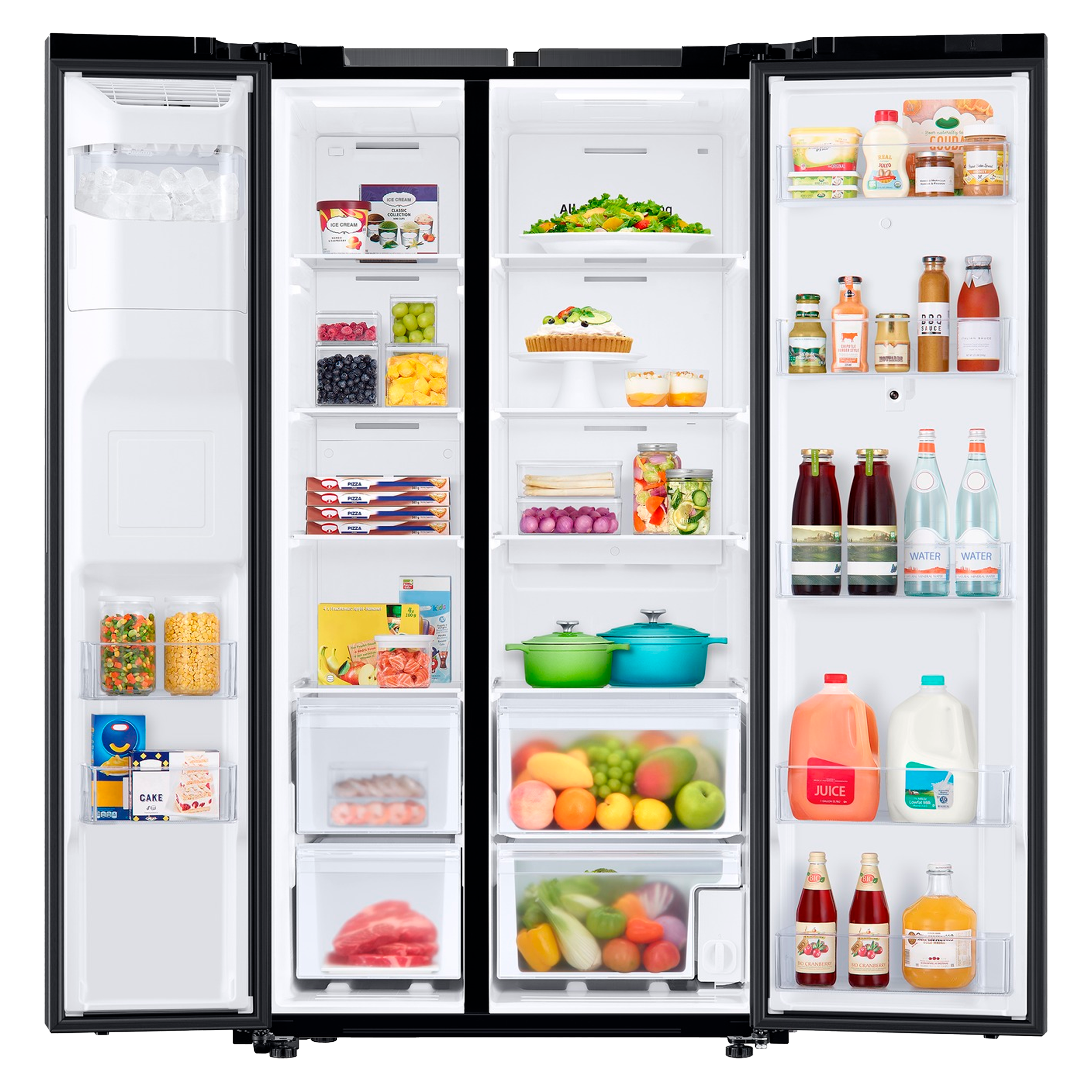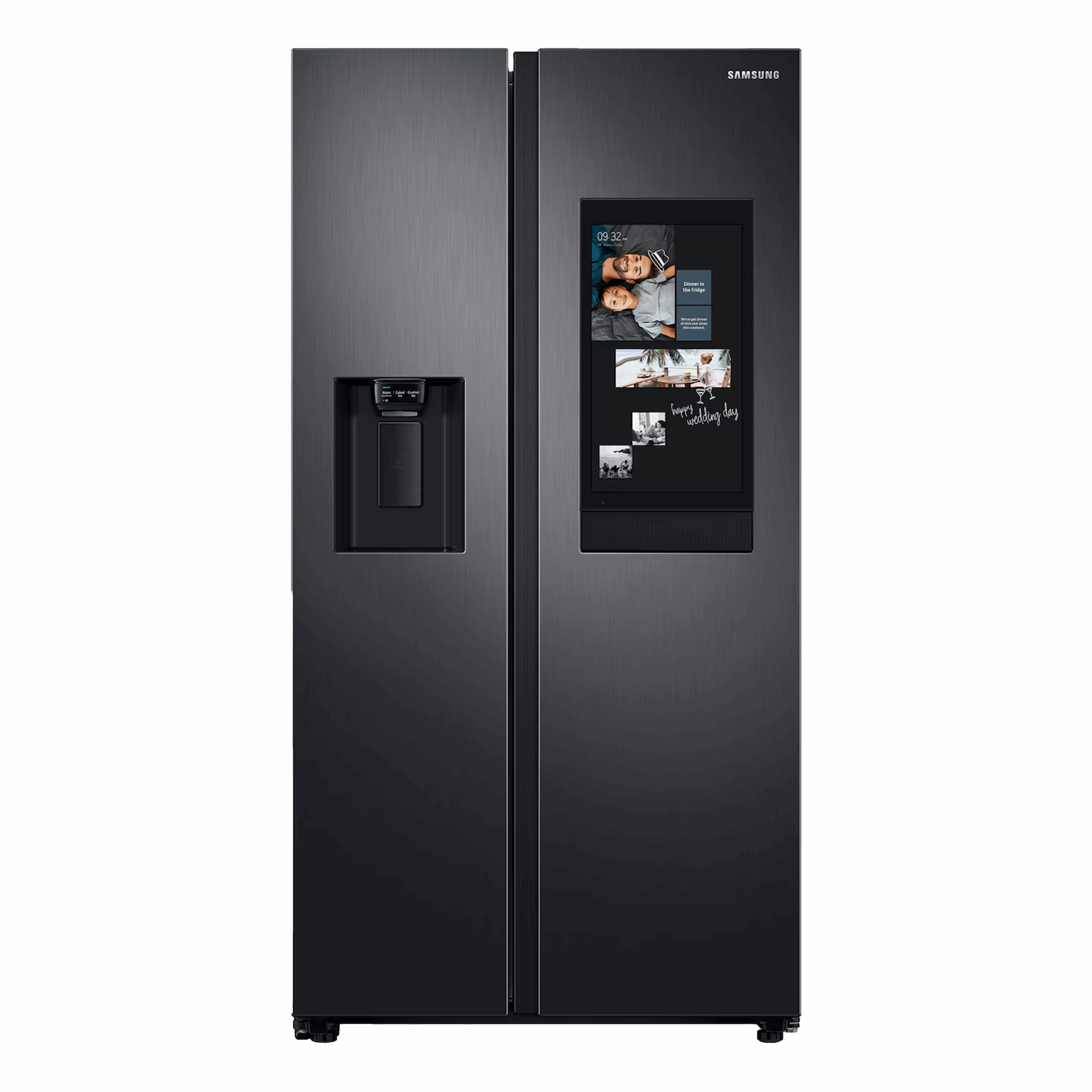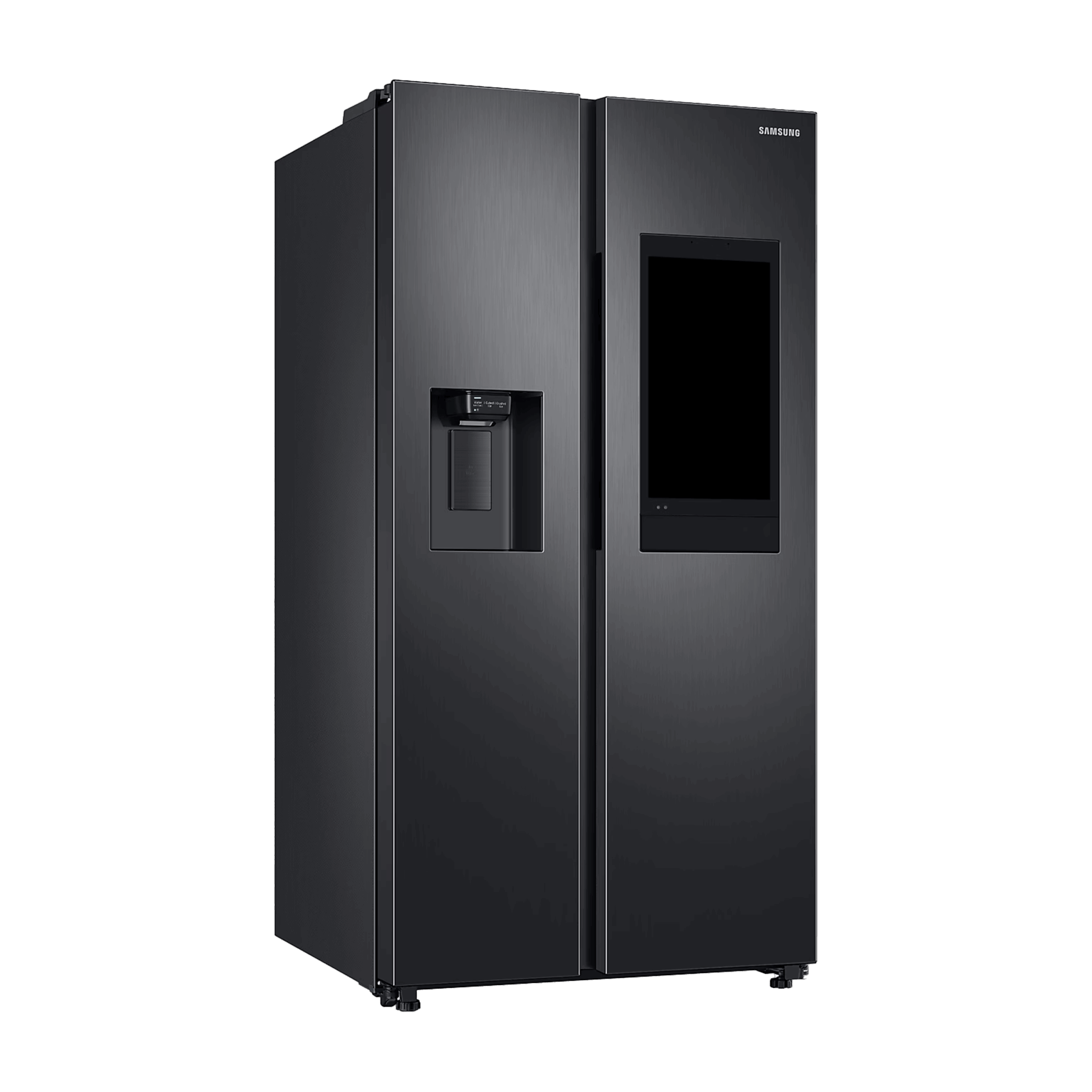 Refrigerador Side by Side Family Hub de 585 litros netos (634 L brutos), con pantalla táctil inteligente, compresor Digital Inverter, sistema de enfriamiento No Frost y elegante acabado en negro Jet.