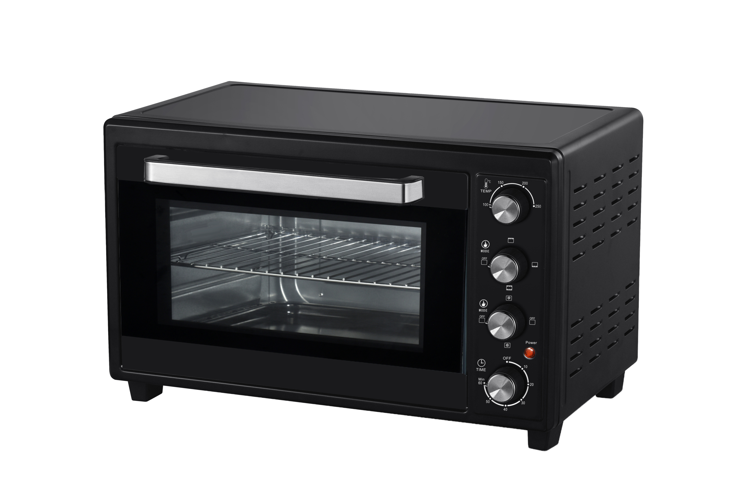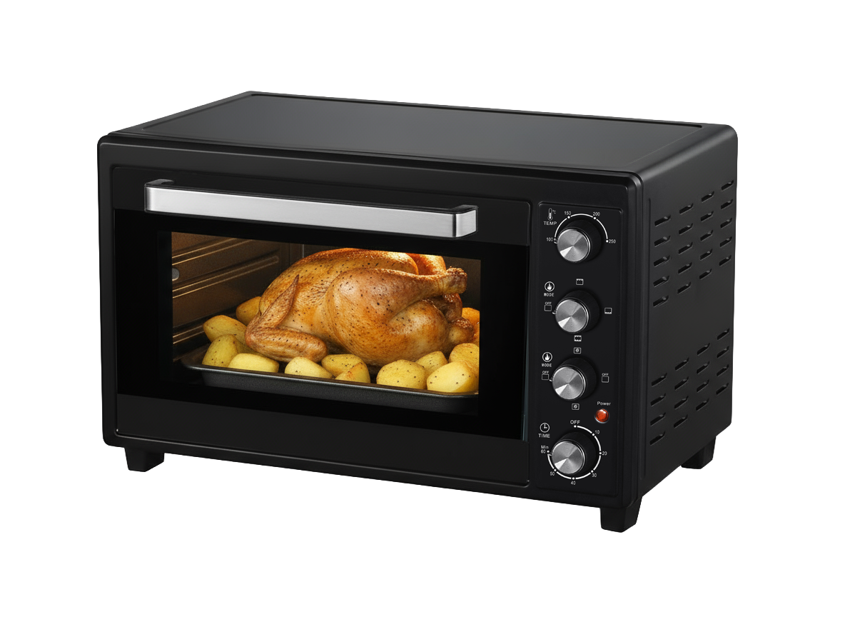 Horno eléctrico multifunción de gran capacidad con sistema de convección, diseñado para hornear, asar, tostar, gratinar y cocinar con rotisserie de manera uniforme y eficiente. Ideal para preparaciones más grandes y variadas en el hogar.