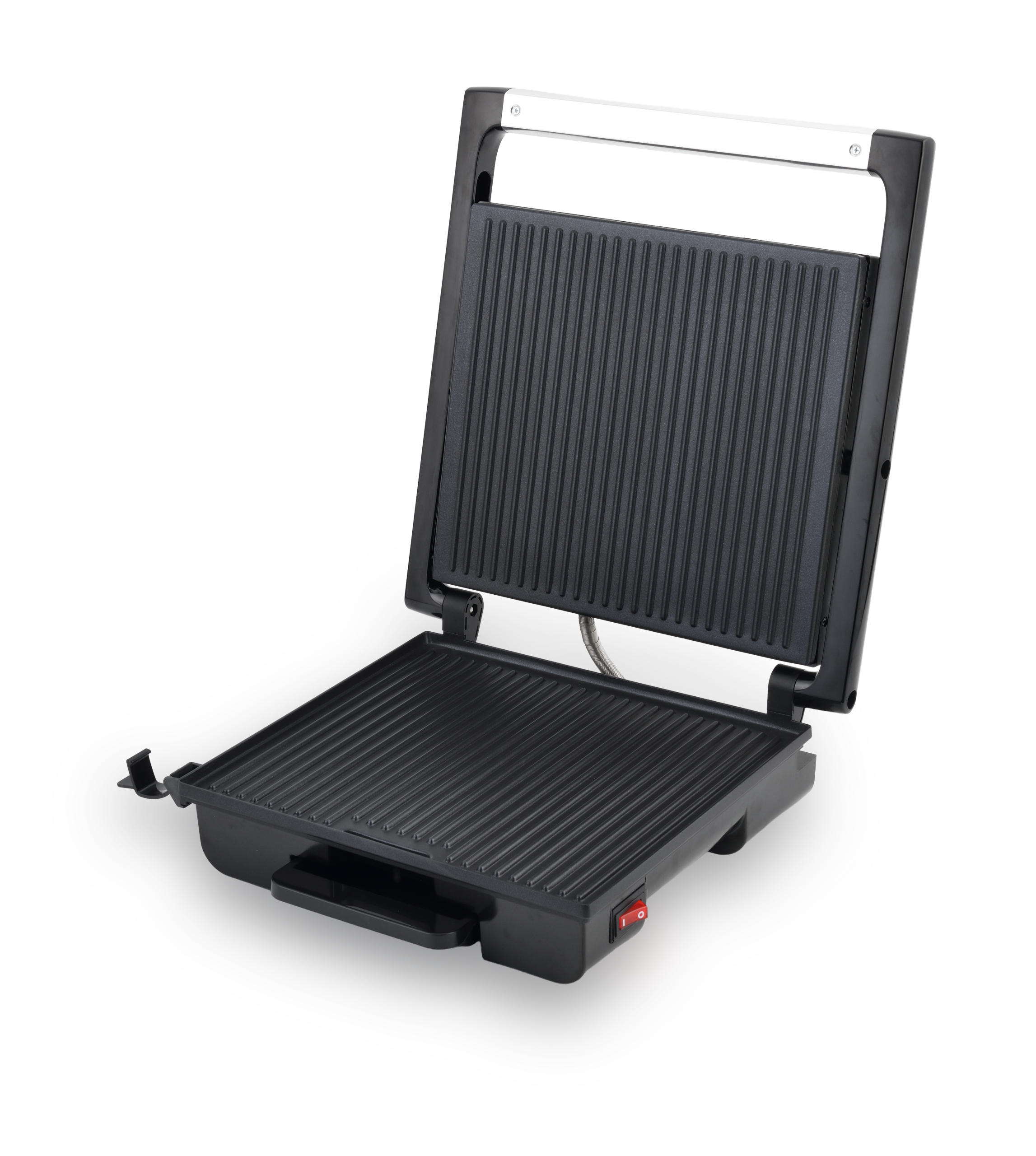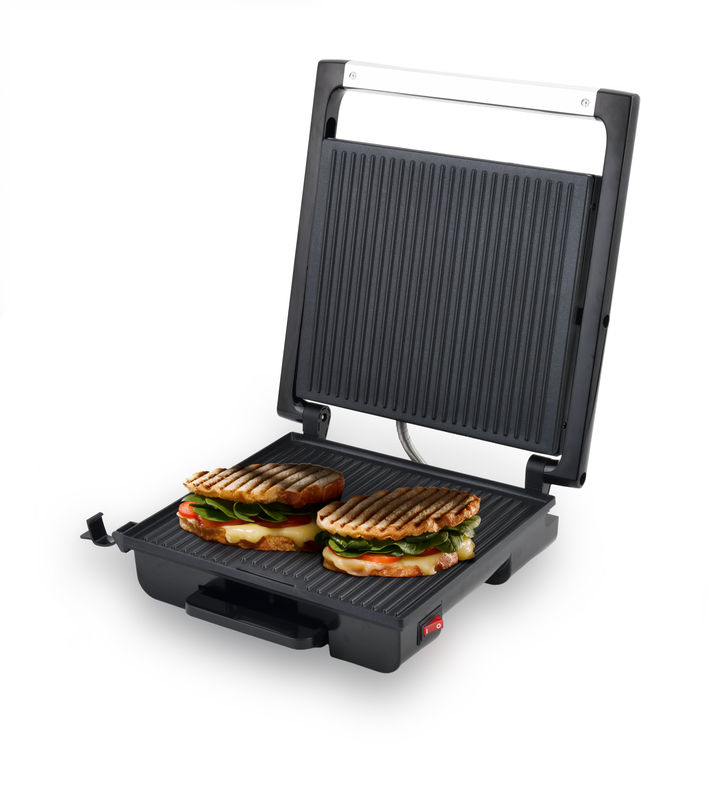 Parrilla tipo panini diseñada para preparar sándwiches calientes, paninis, quesadillas y más, con placas antiadherentes y tapa flotante que se adapta a diferentes grosores para una cocción uniforme.